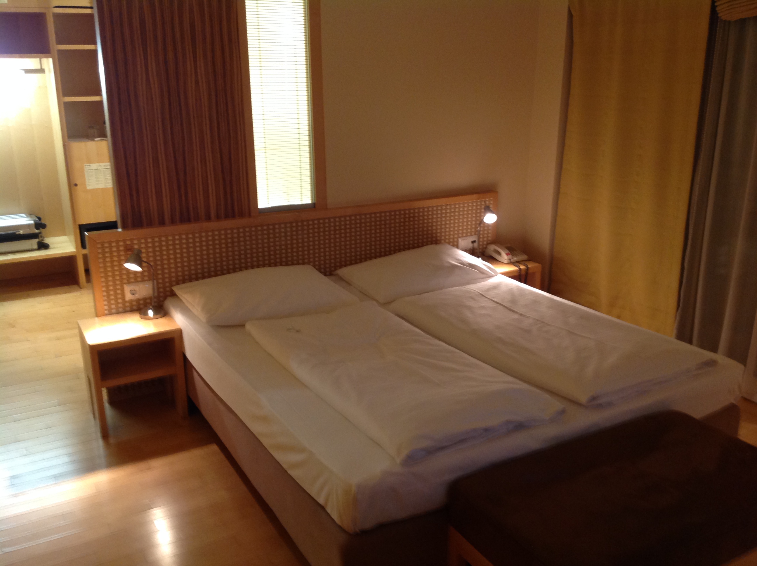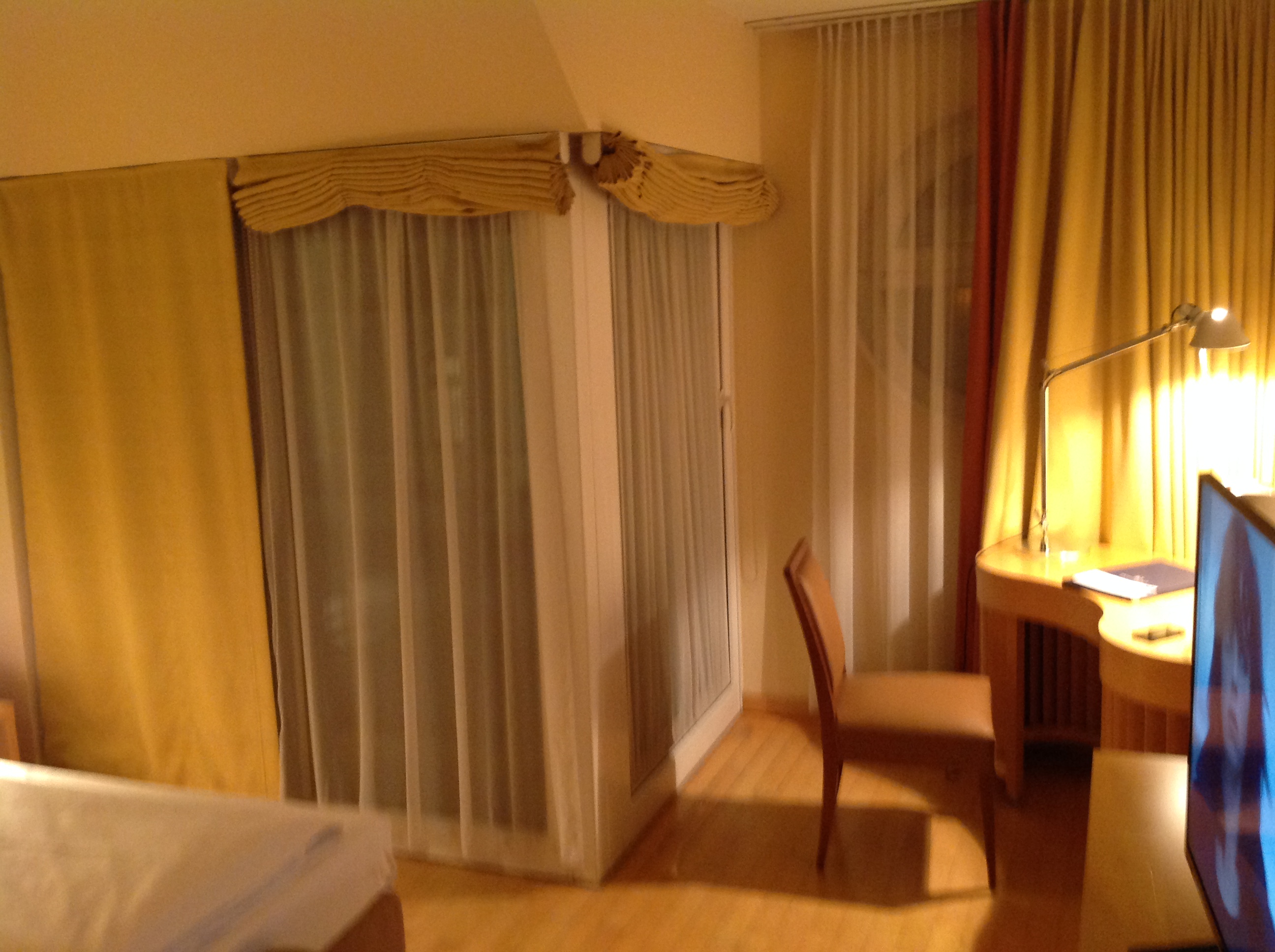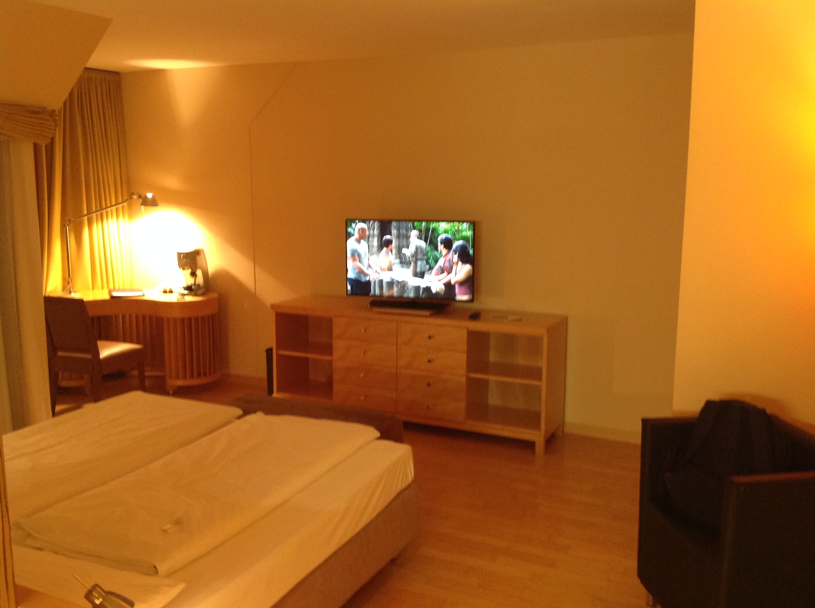 Als ich kurz darauf mein Macbook am Schreibtisch anstöpseln wollte kam das Große AHA – und ich verstand. Es GIBT am Schreibtisch gar keine weitere Steckdose! So ganz allgemein betrachtet, herrscht im Zimmer generell Steckdosen-Notstand. Einzig auf einer Bettseite befindet sich ein einsamer Stromlieferant, und natürlich auch im Badezimmer ist noch so ein Ding verbaut. Liebe Hotelleitung, heute haben nicht nur Geschäftsreisende – aber gerade diese – mehr als nur ein Handy mit, dass sie gerne mit Strom versorgen würden. Eine simple Dreifach-Steckleiste am Schreibtisch wäre nicht DIE Investition.
