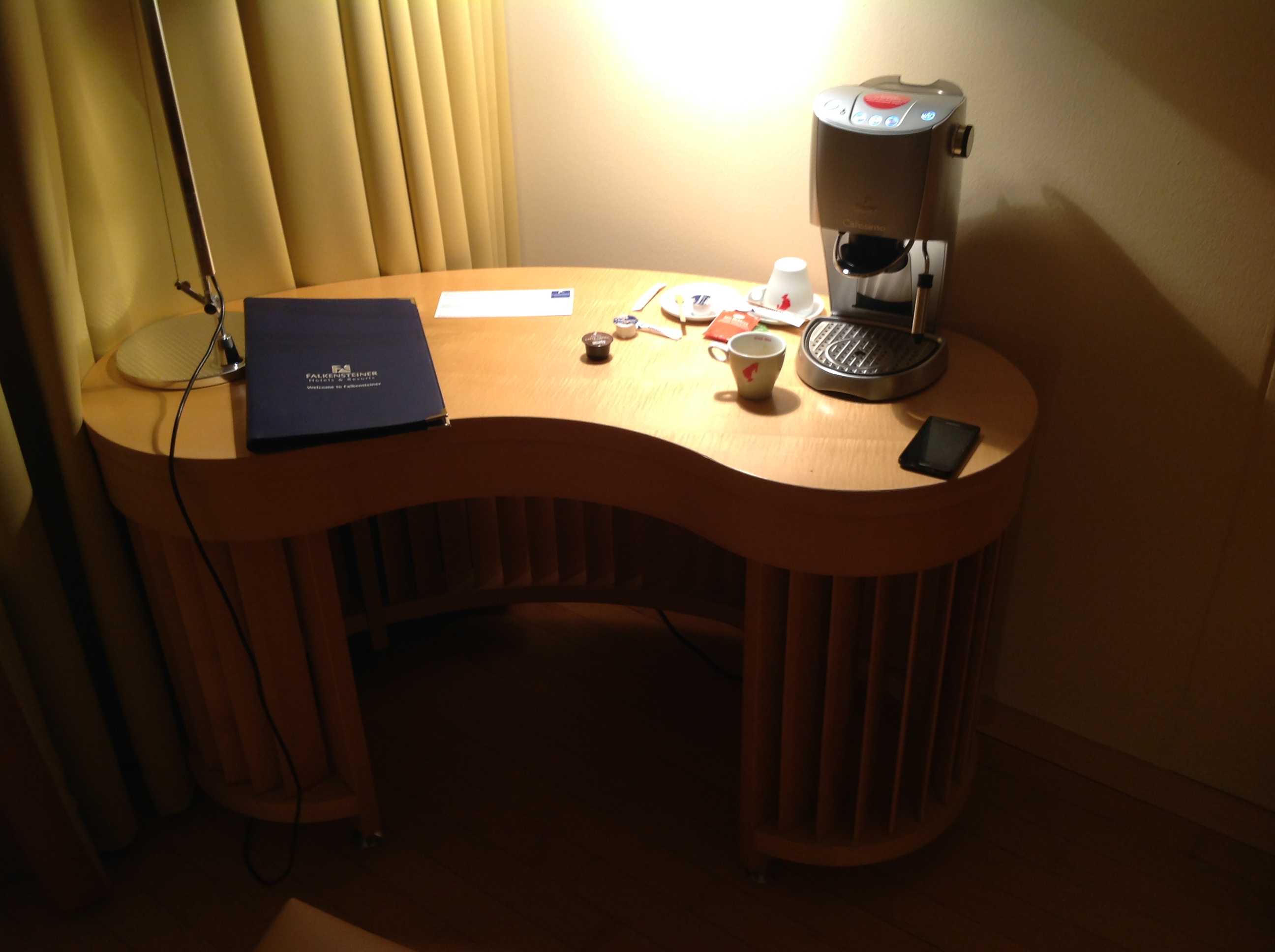 Im Rahmen einer Dienstreise nach Wien nächtigte ich am Donnerstag im Hotel Falkensteiner am Schottenfeld. Eines der netten Features des Hotels ist, dass am Zimmer ein Kaffeeautomat steht – lecker :). Als ich diesen aktivieren wollte tat sich aber nichts. Mal wieder typisch, dachte ich mir. Da kommt man Abends ins Zimmer, hat geduscht und möchte sich gemütlich eine Tasse Kaffee gönnen, und dann funktioniert das Ding nicht. Frei nach dem IT-Crowd Motto – “Did you plug it in?” – “Have you tried to turn it off and on again?” – begab ich mich auf die Suche nach der Steckdose, die das Gerät mit Strom versorgen sollte. Wie auf dem Artikelbild zu sehen fand ich sie schließlich – hinter dem Schreibtisch, kurz über dem Boden. Und ja – sie war ausgesteckt ;-).